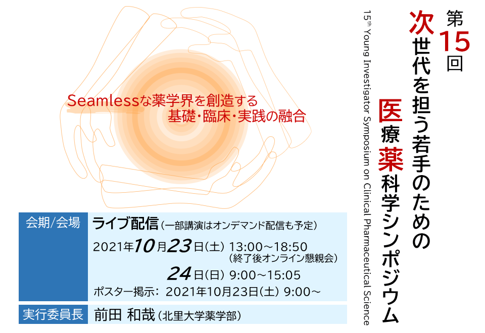 この度、「第15回次世代を担う若手医療薬科学シンポジウム」を、2021年10月23日(土)、24日(日)の2日間、オンライン開催することとなりました。昨年次がCOVID-19禍のために急遽オンライン開催に変更され、face-to-faceのコミュニケーションができなかったこともあり、本年度は何とかオンサイトでの開催を目指しておりましたが、COVID-19の予想以上のまん延もあり、毎年、相当数の医療従事者の先生方のご参加もいただく本シンポジウムの最適な開催方法について、組織委員の中で議論を重ねた結果、苦渋の選択として本年度も全面オンライン開催に踏み切ることといたしました。ただ、色々な会合がオンライン開催になる中で、新しいコミュニケーション手段も急速に開拓をされてきております。今回は新たな試みとして、ポスターセッションと懇親会において、リアルタイムでコミュニケーションしていただけるよう、Remoを導入し、できる限り対面での会話に近づけるような工夫をするなど、従来型の対面での会合でしかできなかったことを実現化すべく準備を進めております。